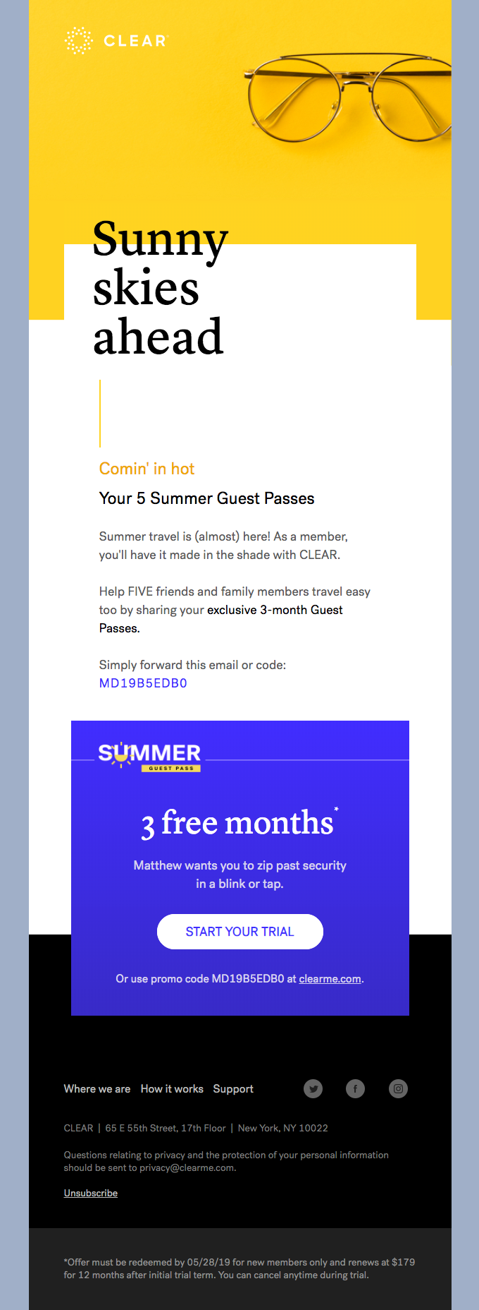 Simple, eye-catching email design is crucial for customer engagement and will encourage subscribers to read through your entire email. By keeping the text short and scannable (like Clear does in the example below) and ensuring the template is optimized for mobile, you’ll ensure it’s easy to read on any device or screen size. After all, recipients open more than half of emails on mobile devices.