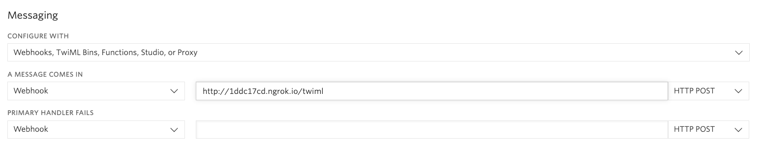 This gives us a publicly-accessible URL to your application. If you haven't bought a Twilio phone number yet, buy one now and configure it by adding your ngrok URL with /twiml appended to it as shown under the “Messaging” section below: