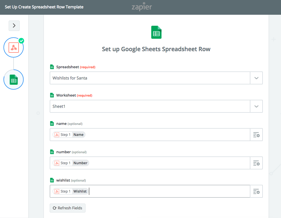 Next, we need to equip the Zap we’ll setup some information—the name of the gift requestor, their phone number, and the gifts they asked for. To do this, we’ll give our add_to_spreadsheet widget the following HTTP Parameters: