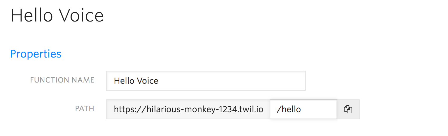 Now it’s time to build your Function. Make sure your Function has a descriptive name so you can reference it in other parts of the Twilio Console. For now, you can leave it as Hello Voice. Next, set the path for your Function. Every Twilio account is provisioned a unique domain to use with Functions. The combination of your unique domain and the path gives you a fully qualified URL that can be used to invoke your Function. You can set the path for this function to ‘/hello’. Since you used a Template, the code section has been pre-populated for you: