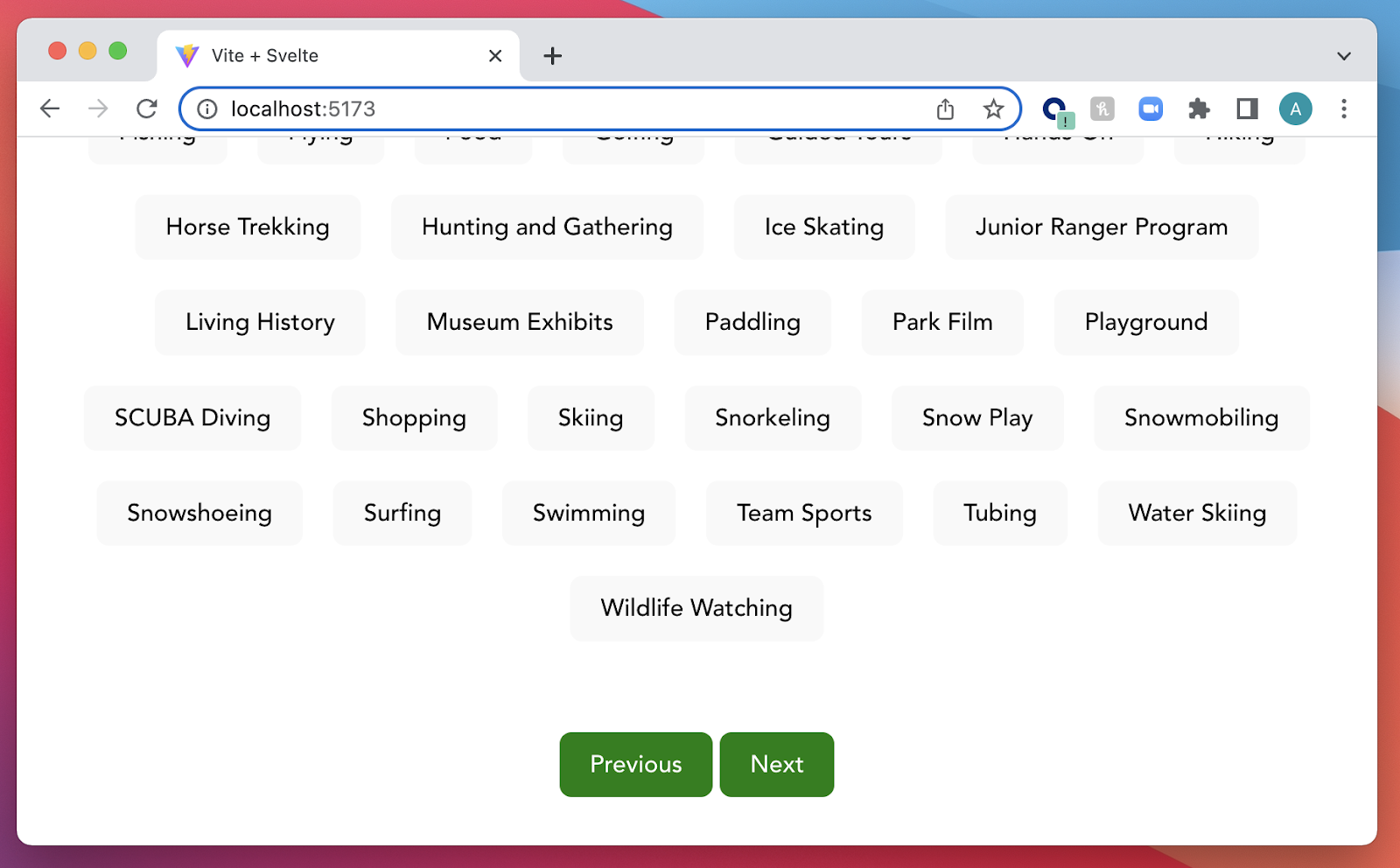 When the user clicks Begin they will be presented with a screen where they can select activities that they would like to be able to do when they visit a national park: