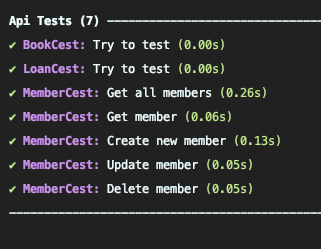 With the test suite in place, let's create our test classes (Cests). Create three new Cests to test the endpoints for Members, Books, and Loans, using the following commands.