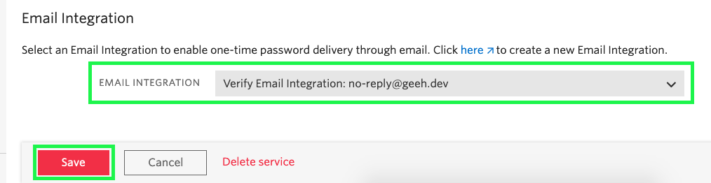 To have access to the verify API, we'll need to create a Verify service. Head over to the Verify Services page of the Twilio Console, and click the big red Create Service Now button, and give it a Friendly Name. The only thing we need to change is right at the bottom of the page, select your Email Integration we created in the last step from the Email Integration drop-down at the bottom of the page, and hit Save.