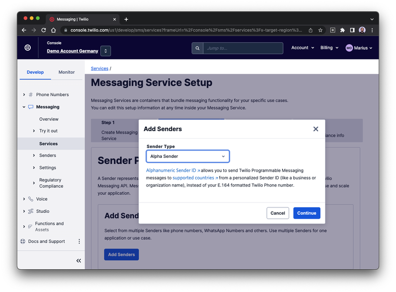 Fügen Sie anschließend Ihrem Messaging-Dienst eine alphanumerische Absender-ID hinzu, indem Sie auf Add Sender (Sender hinzufügen) klicken, den Absendertyp im Pop-up-Fenster „Add Senders“ (Sender hinzufügen) auf „Alpha Sender“ (Alpha-Absender) setzen und dann auf Continue (Weiter) klicken.