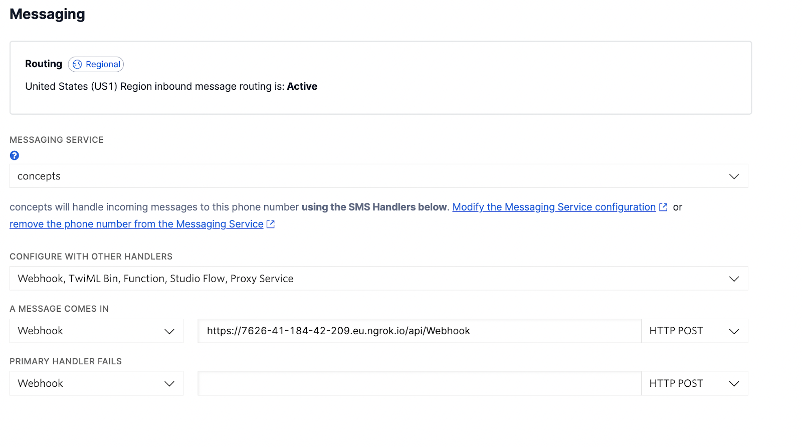 Log on to the Twilio Console. Click on Explore Products option on the left panel and search for the Phone Number feature under the Super Network section. Click on the Phone Number option. This opens up a list of Active Numbers. Click on the Twilio Phone Number that you wish to use. Once the new page opens, navigate to the messaging section, and update the Webhook for the A MESSAGE COMES IN section with the ngrok URL.