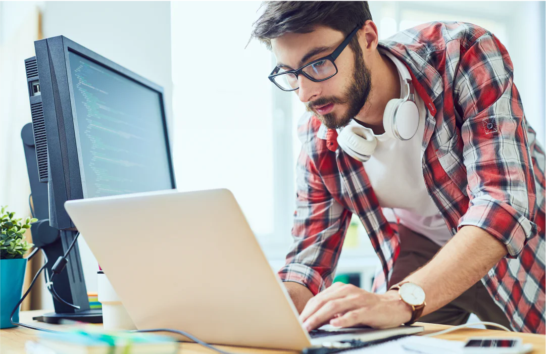 Man with headphones and smartwatch standing with arms crossed against a dark background.