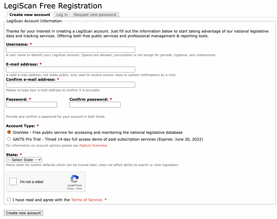 To use the LegiScan API, you must first create an account to get your API key. Be sure to fill out all the required information and sign up for the free account type.