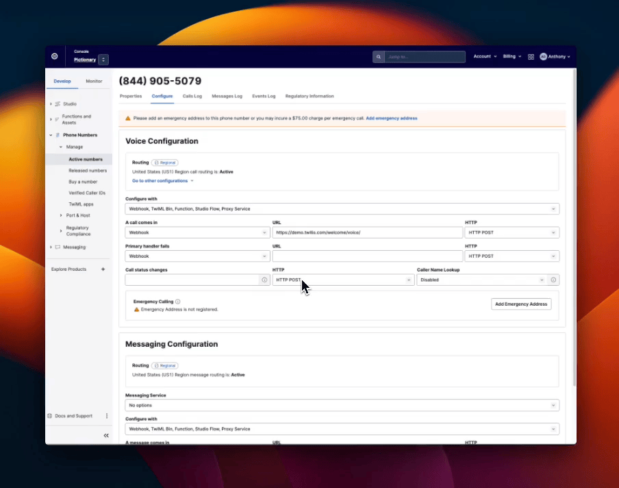 - Click on the Twilio phone number you purchased earlier (or want to modify).