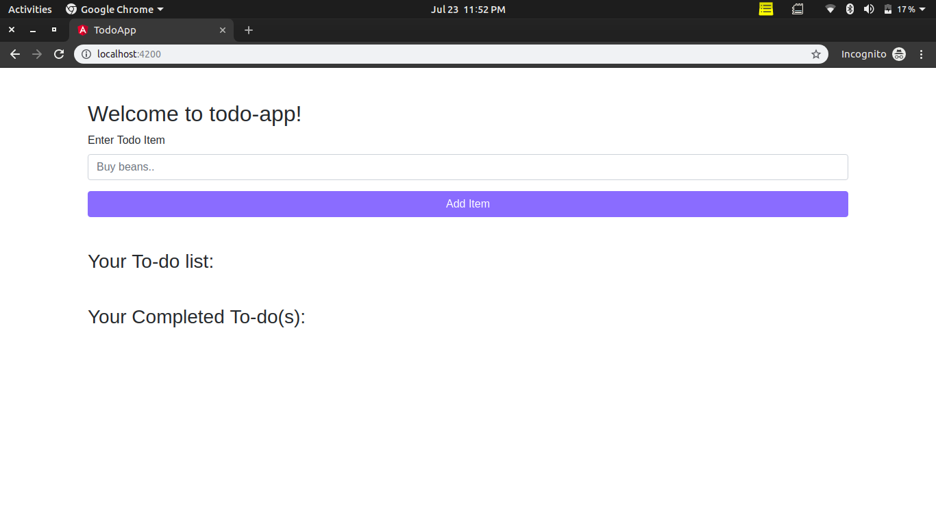 If the above command runs successfully, proceed to open up a web browser and navigate to http://localhost:4200/. You should be greeted with a page similar to this: