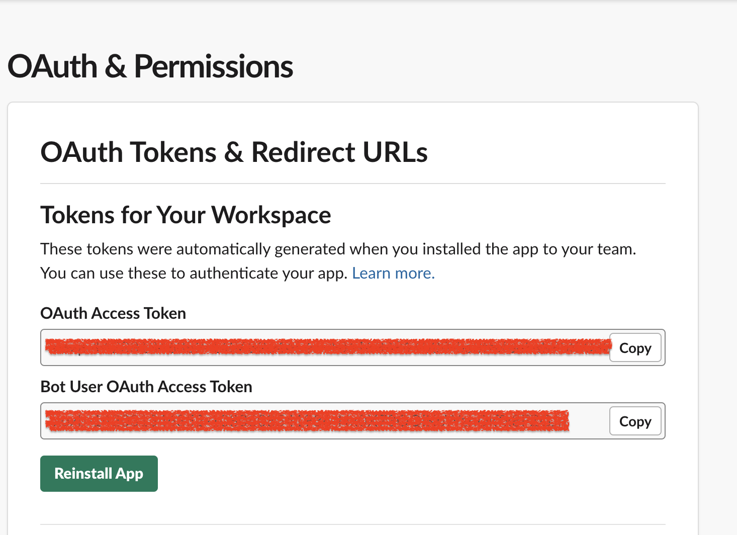 After you’ve saved these settings, we need to install the bot to a Slack workspace so that an API token can be generated for us. Head back to the “Basic information” page and open the “Install your app to your workspace” dropdown. Click the “Install App to Workspace” and grant the necessary permissions. Once this is done, select “OAuth & Permissions” under the “Features” tab and take note of the “Bot User OAuth Access Token” that was generated for the bot. We’ll be needing it shortly.