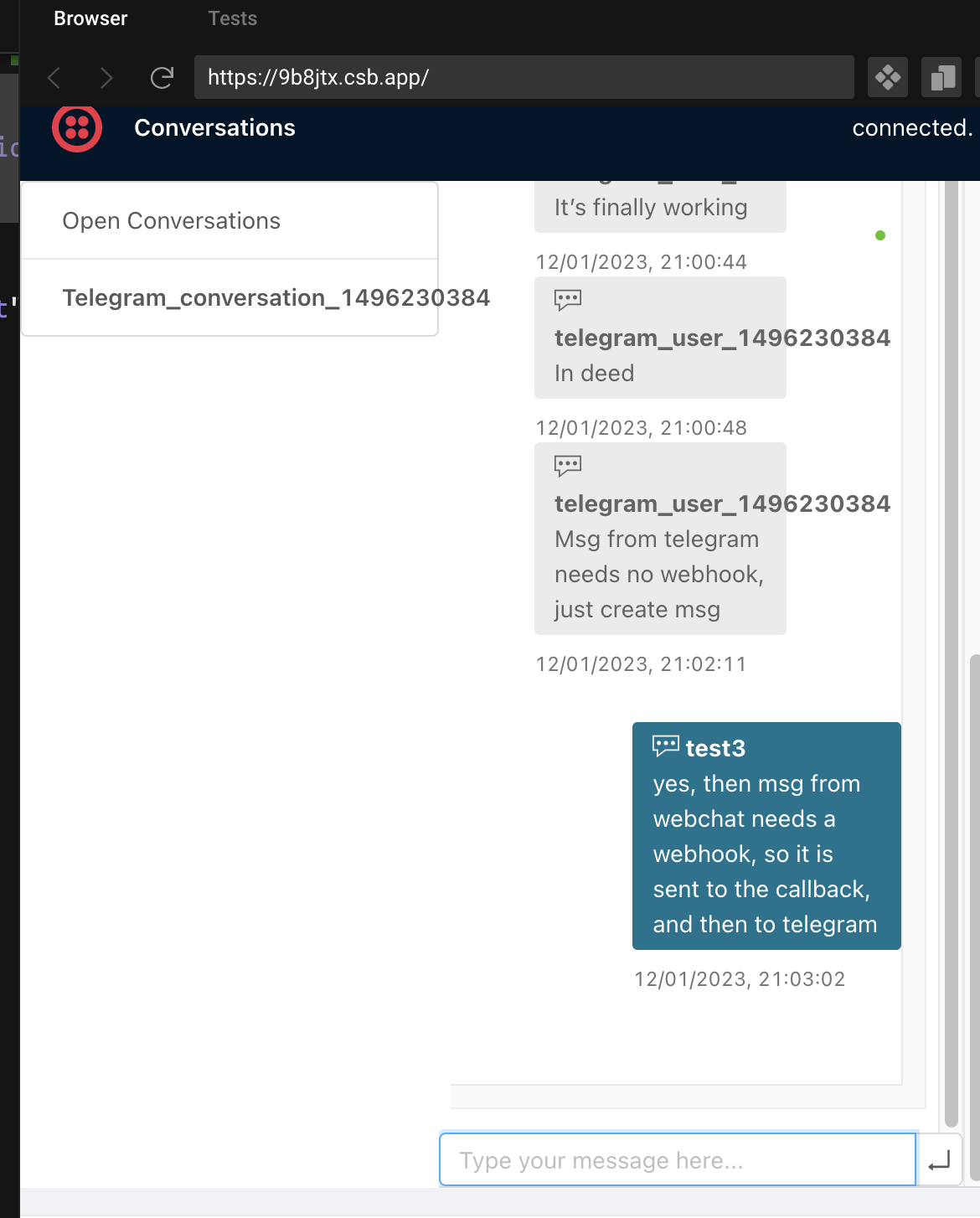 This Conversations quickstart creates a demo application that provides a basic Javascript-based chat UI using CodeSandbox.io. In this demo, we will add a Telegram bot to the conversation and use Twilio Functions for backend logic implementation.