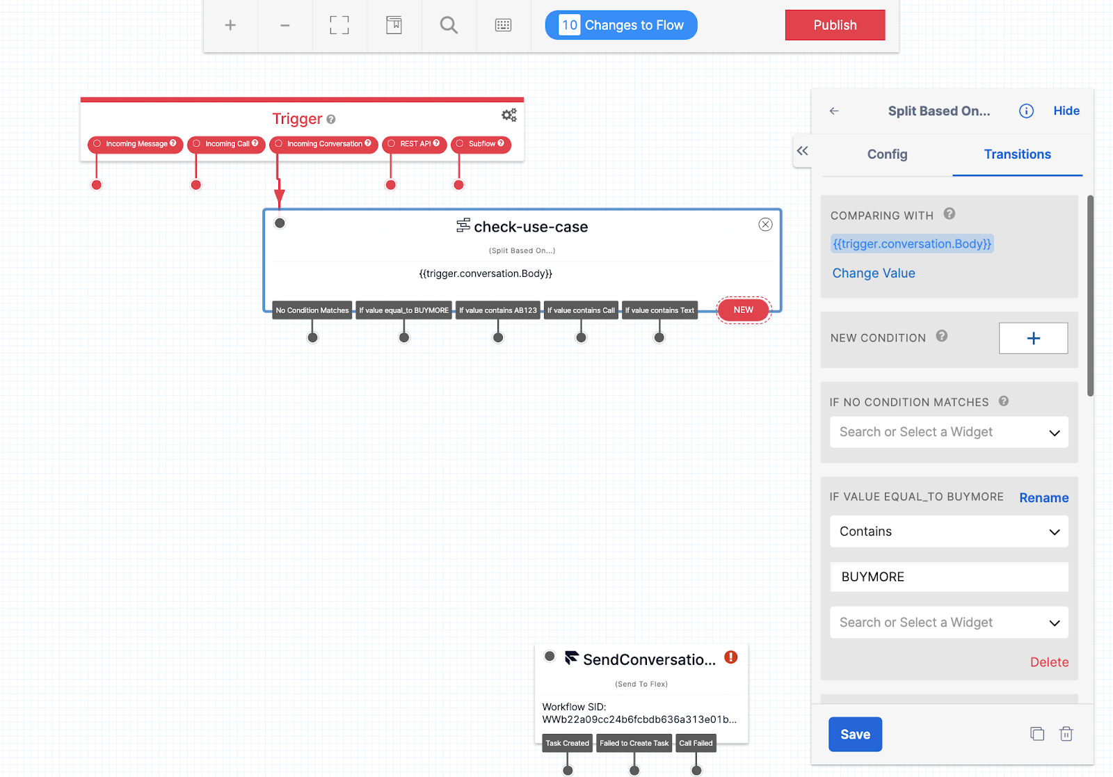 - Connect the Split for No Condition Matches to help, BUYMORE to Coupon, AB123 to store-AB123-gift, and Call and Text to SendConversationsFlex, then hit Publish: