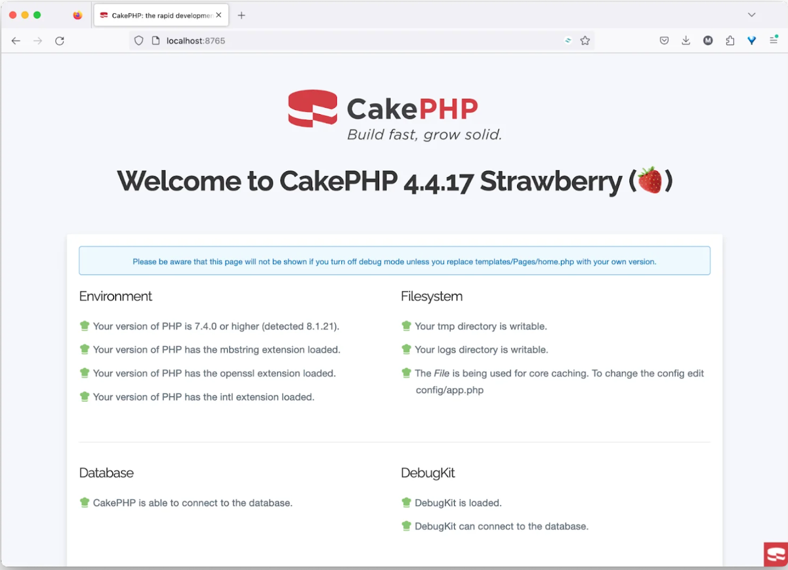 The new CakePHP project will be available in a directory named cakephp_crud, and you'll have changed to that directory.