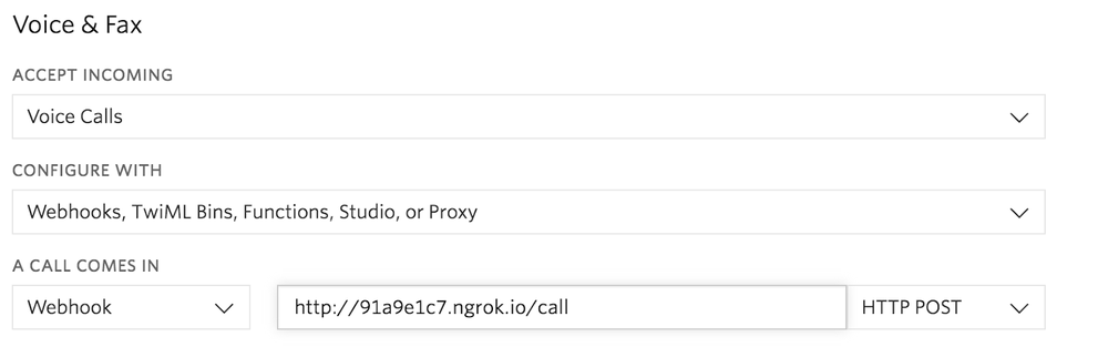 Ngrok provides us with a publicly accessible URL to the Express app. Configure your phone number in your Twilio Console as seen in this image by adding your ngrok URL with "/call" appended to it to the "A Call Comes In" section: