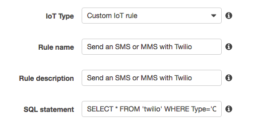 So now you've got the LinkIt ONE and AWS IoT conversing over MQTT - you're most of the way to the prize. Our second middleman is AWS Lambda, where we will set up a function which is called for certain MQTT messages and will do the actual conversing with Twilio.