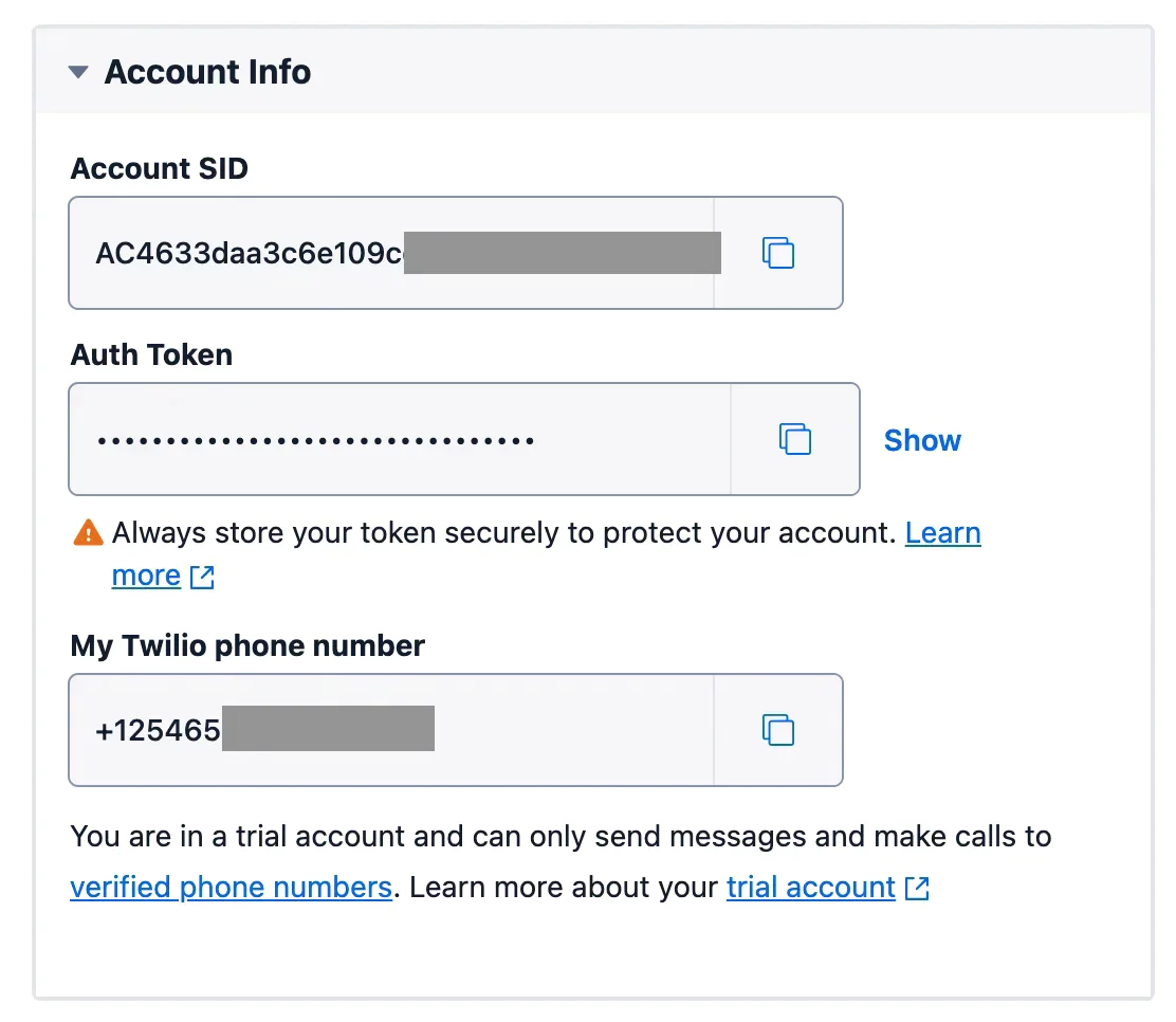 Now, let’s retrieve your Twilio credentials. To do this, log in to your Twilio Console dashboard. In the Account Info section, you’ll find your Account SID, Auth Token, and Twilio phone number, as shown in the screenshot below.