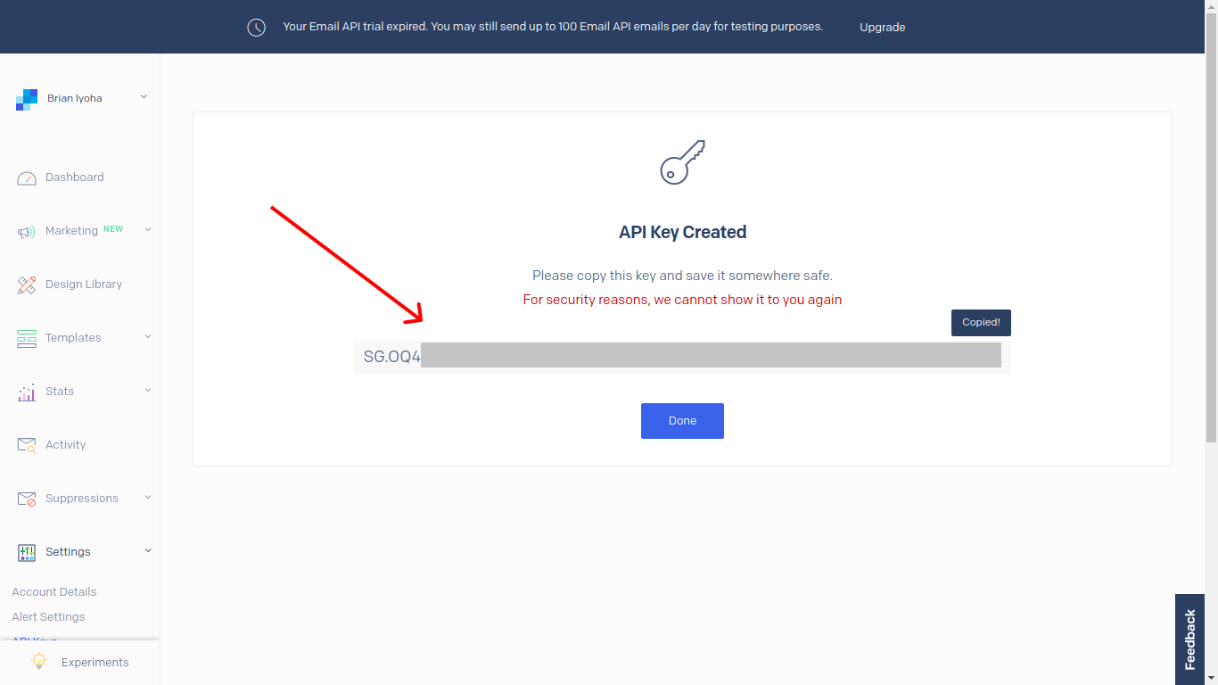 After the successful installation of the SendGrid library, head to your SendGrid dashboard to retrieve your API key. It will be used to authenticate requests made with the library.