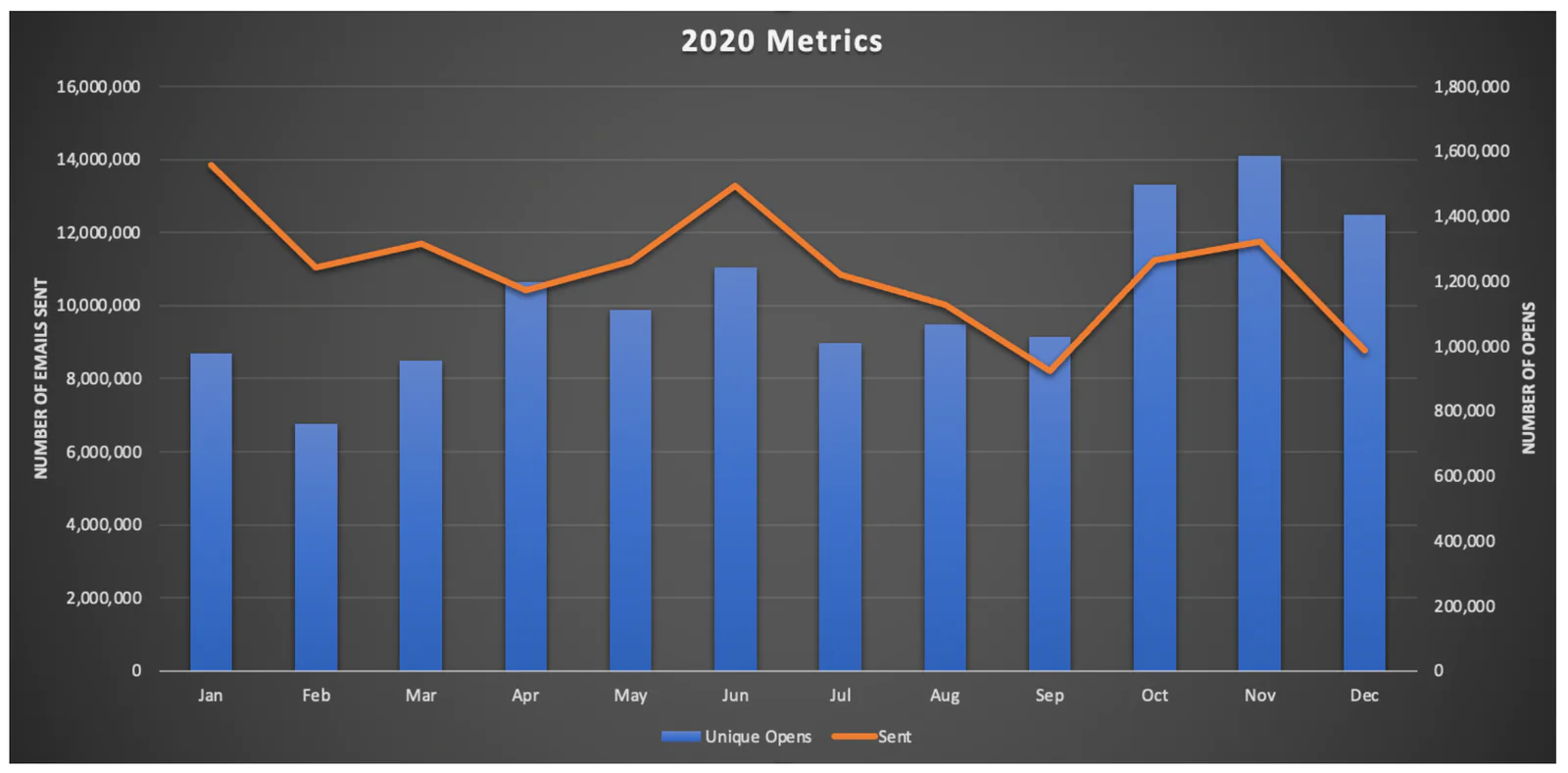 They doubled their unique open rate from the beginning of 2020 to the end of 2020. Plus, they also saw a 65% reduction in the number of spam traps hit daily. With the reduction in spam trap hits and the increase in engagement rates, they saw a big improvement in emails landing in the inbox rather than the spam folder. Even though they sent to fewer subscribers as the year went on, they saw their unique opens and clicks increase drastically.