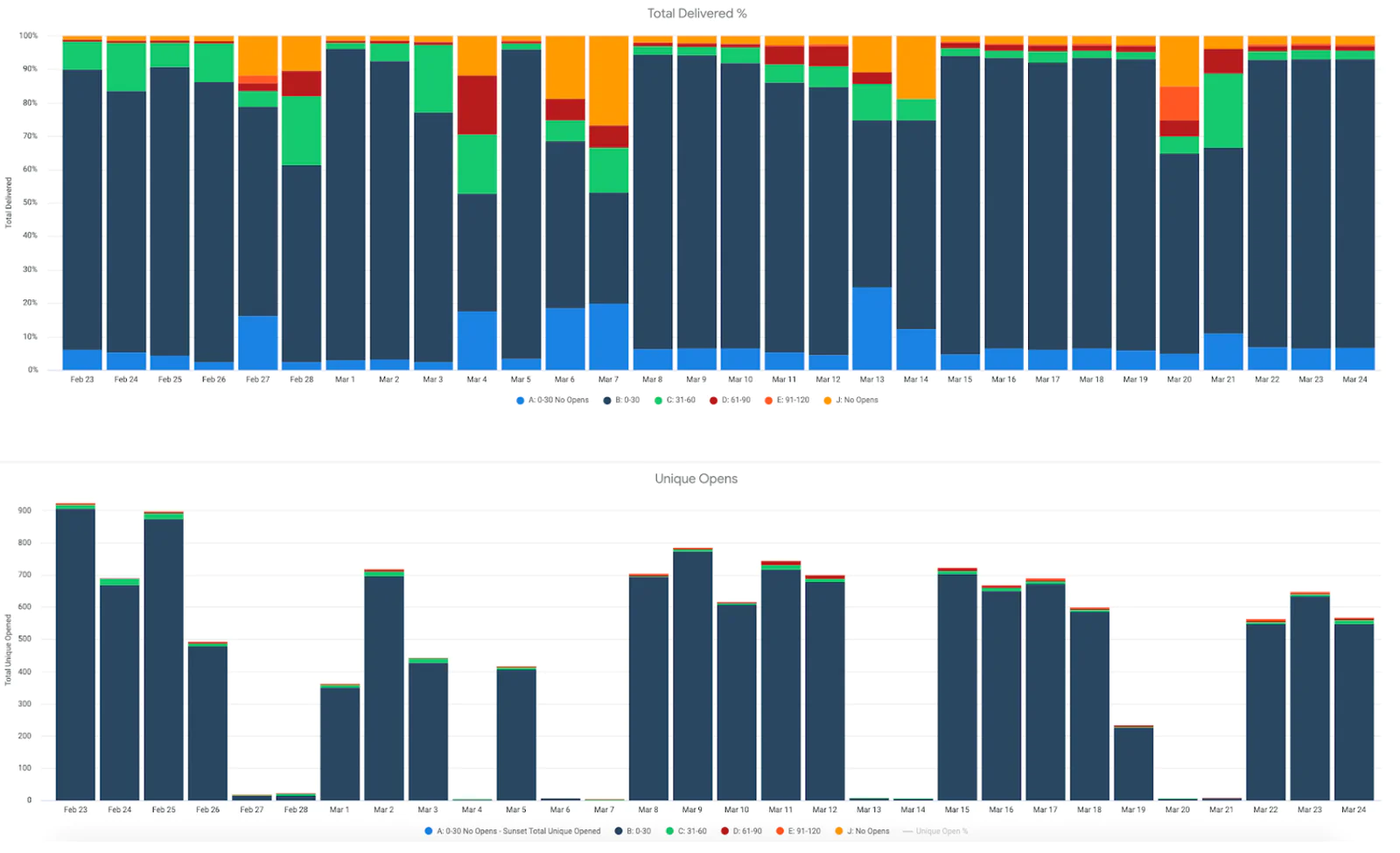 As we can see from this example, this brand does a great job with sunset levels. Between 80–90% of emails are sent to subscribers who opened an email within the last 30 days. We can see the drastic reduction in open rates for subscribers that last engaged 31–60 days ago, 61–90 days ago, etc.