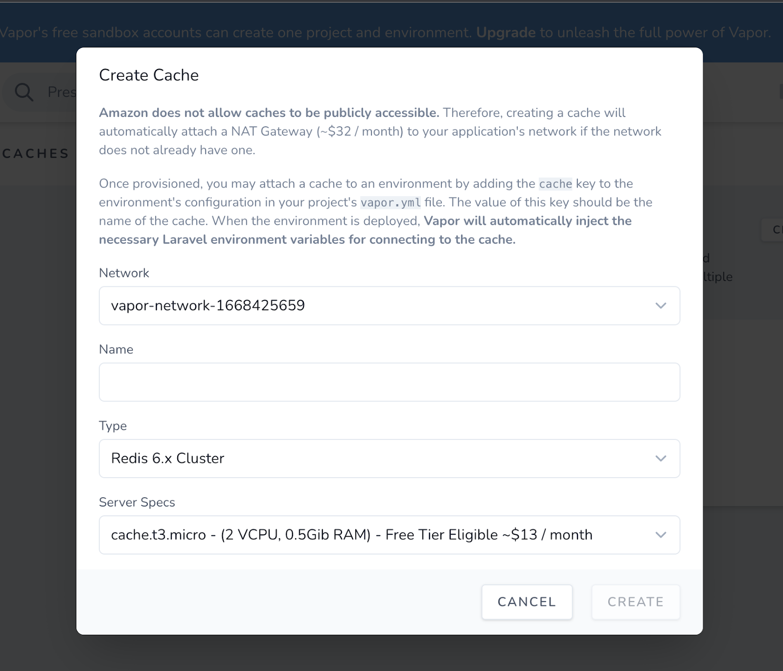 To create a new Redis cache, navigate to the Vapor Cache section and click “CREATE CACHE”. You will be prompted with a modal dialog like the one below. Fill out the form with your desired options and click “CREATE”.