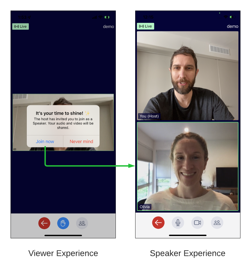 After the host sends the speaker invite, the viewer is able to become a speaker.
