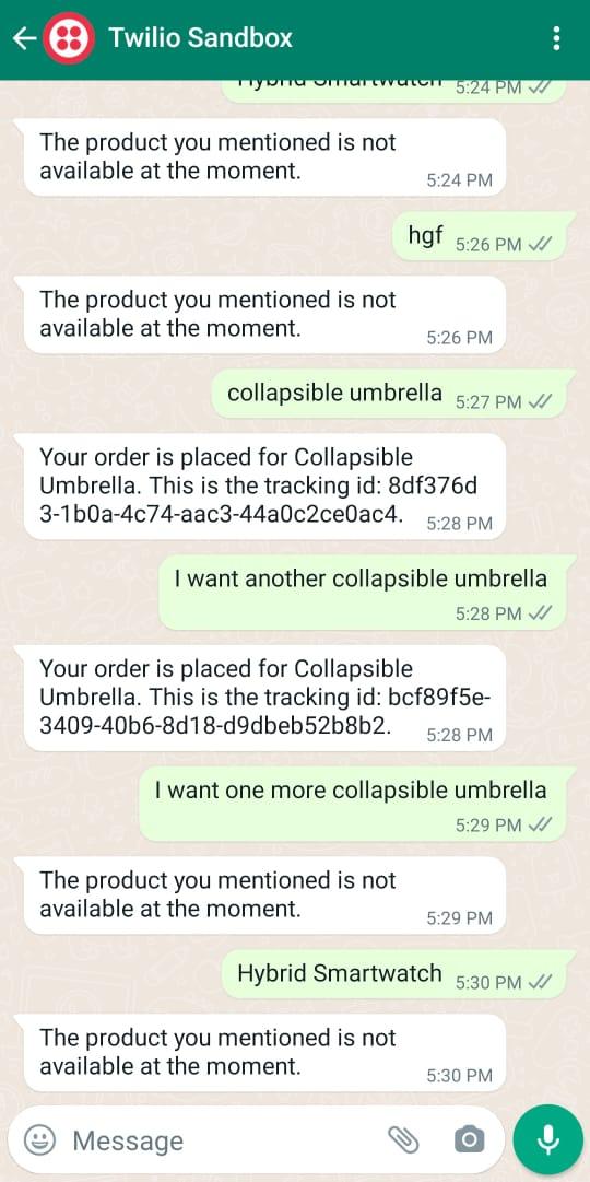 "Your order is placed for Collapsible Umbrella. This is the tracking id: <unique-identifier>"