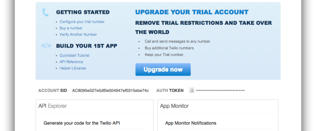 Click on ‘Get started’, and then click ‘Go to your account’ to get started right away. Welcome to your very own Twilio.com dashboard. The two bits of information (highlighted with arrows below) that are most important are your Account SID, and Auth Token. (Click the little padlock to reveal your Auth Token.) These are your username and password to a world a telephony goodness.