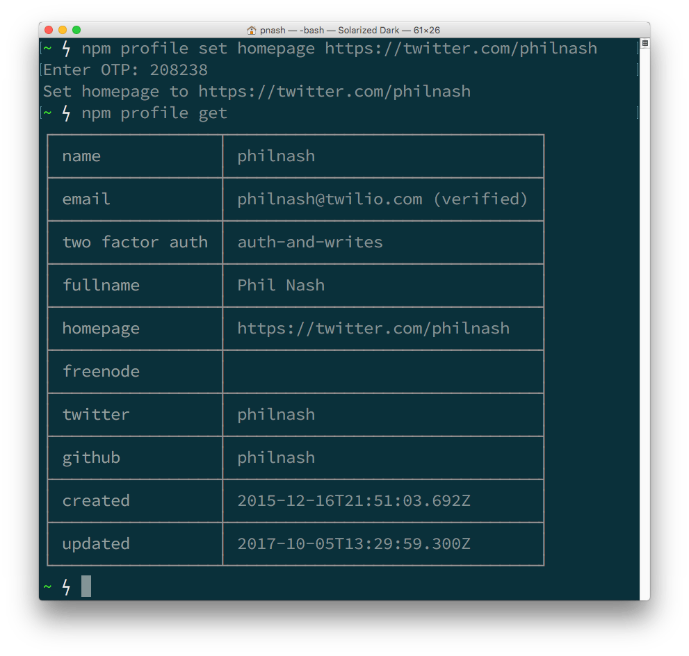 And fill in your details to authenticate your client. Once you are logged in you can then inspect your account with npm profile get.