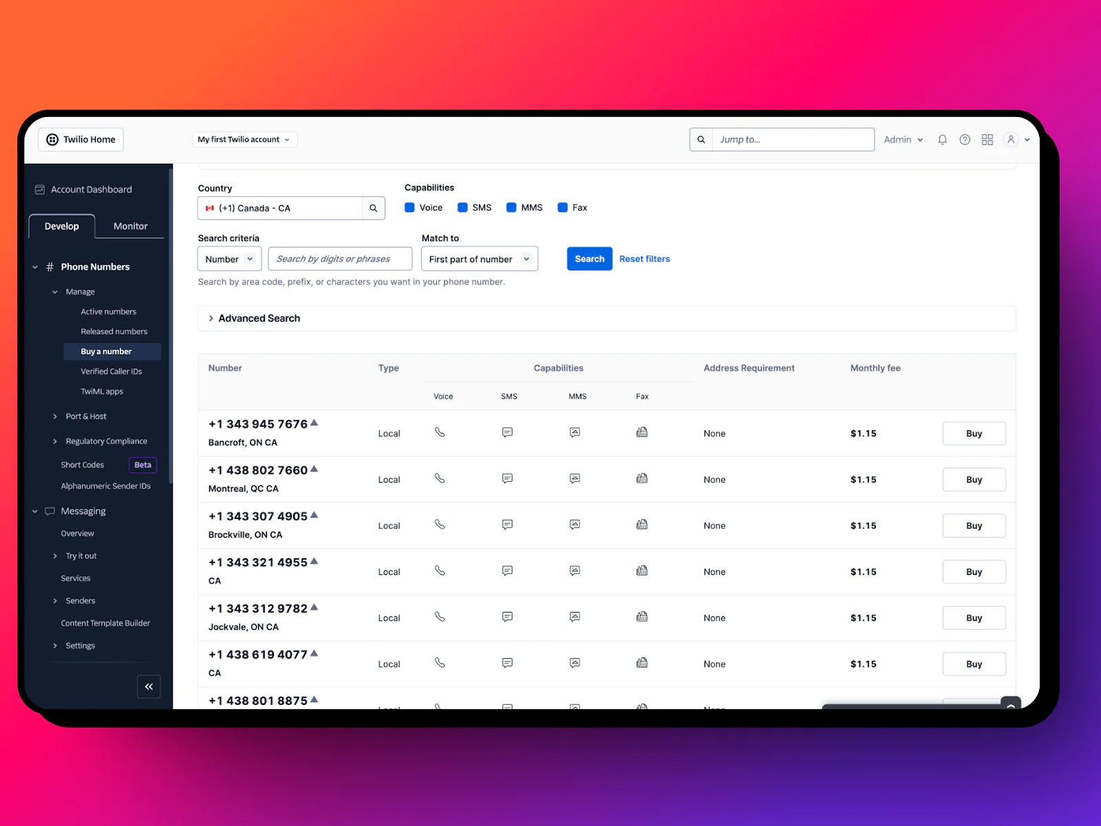 To send a message, first you will need to buy a phone number, ideally from the region you are based in to avoid roaming charges. To do this, go to the Twilio Console and search for a number you’d like to buy.