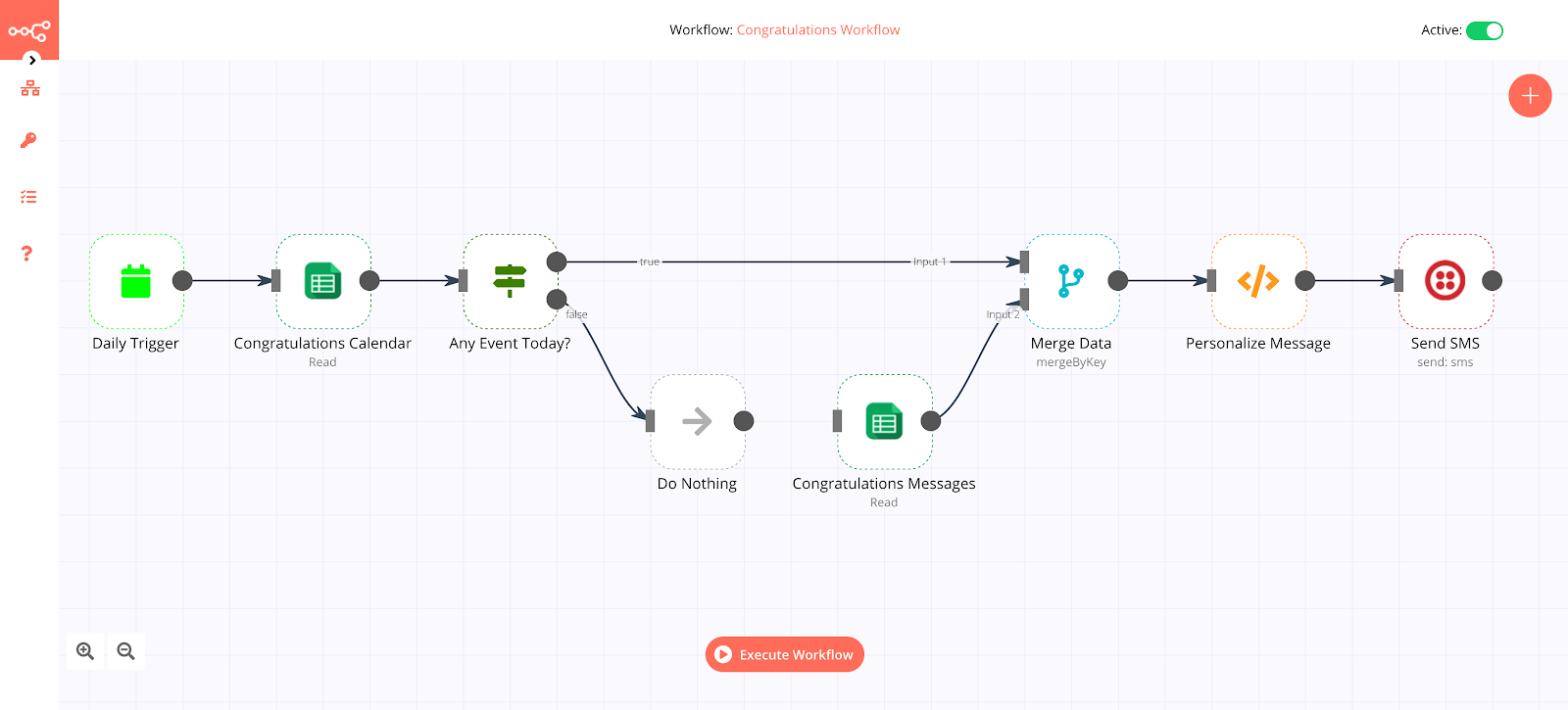 This n8n workflow automates sending out SMS notifications according to your Google Sheets event calendar. Nodes are the action agents in the workflow, they execute, obtain, and send data. The following eight nodes will be used: