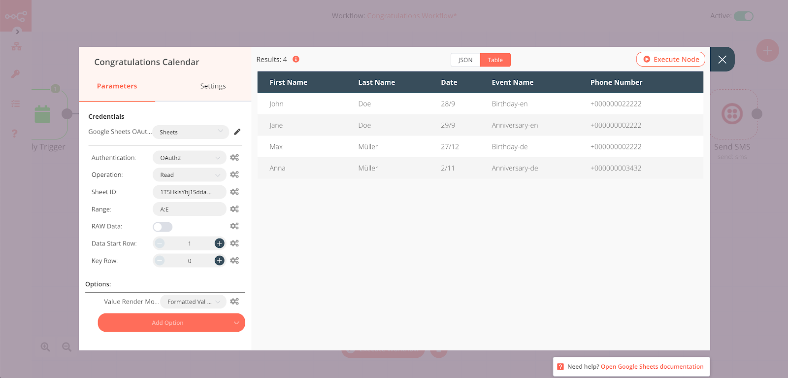 Return to the Congratulations Messages node and click Execute Node. You’ll find all the data from your Google Sheets tab “Congratulations Messages”.