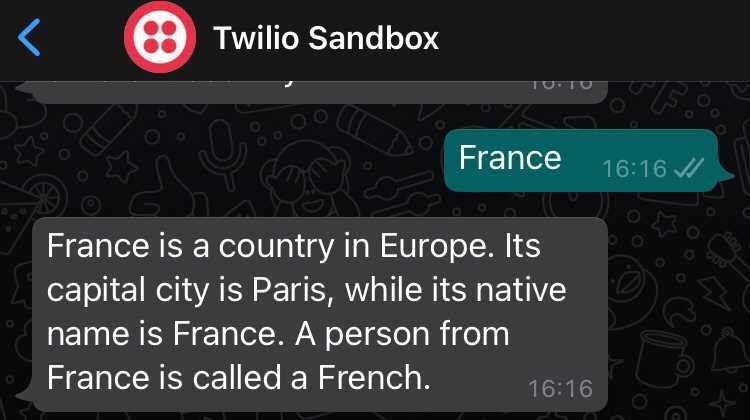 Using the WhatsApp number you connected to the Sandbox, you can now chat with the bot. Send the name of a country to it to get a response from the Python webhook running on GCP. See examples below: