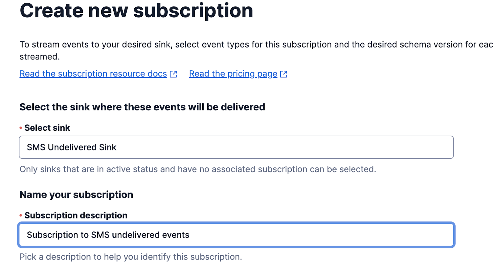 An Event Stream sink needs to have one or more subscriptions to event types. This will let Twilio Event Streams know which event types your application is interested in receiving. In this case, we just want to know when an SMS message is undelivered.