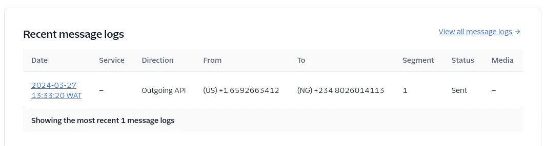 To confirm that the call was successful, go to your Twilio dashboard, click Messaging and then Overview. Scroll to the end of the page, and see the Recent messages log section. The logged message confirms that the message was successfully sent.