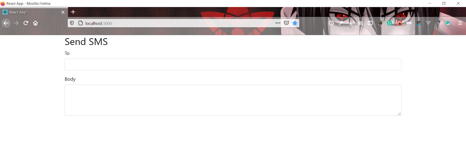Now, add the Form component to the Container component. Your form needs two fields: one text field for the number where the message is to be sent, and one textarea field for the message itself. Label these fields To and Body, respectively. See the following form code: