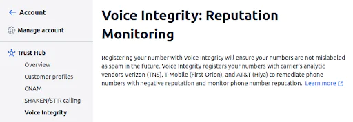 Voice Integrity from Twilio helps you remediate spam labels on your phone numbers and monitor phone number reputation. After you’ve attached your Twilio phone numbers to your approved Business Profile in the Twilio Trust Hub, Twilio will register these numbers with analytic engines for T-Mobile, Spring, AT&T, and (coming soon) Verizon Wireless.