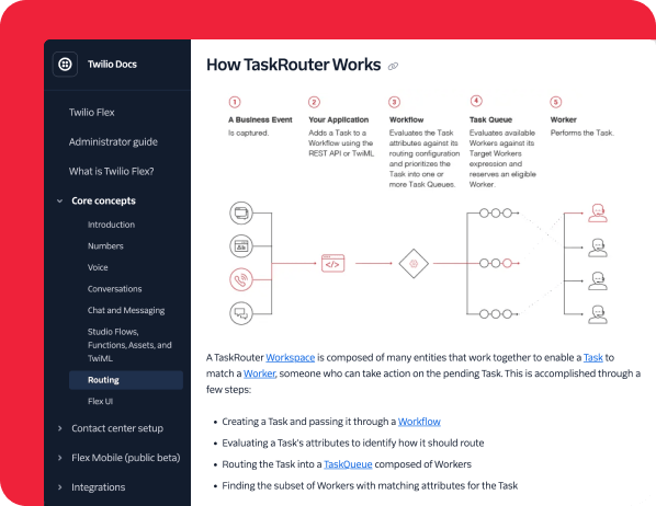 Everything in Flex is customizable, including the routing logic. With TaskRouter, you can set up flows tailored to your exact set up. You can assign tasks (calls, chats, messages) to agents based on skills, availability, attributes, and escalation/fallback rules.