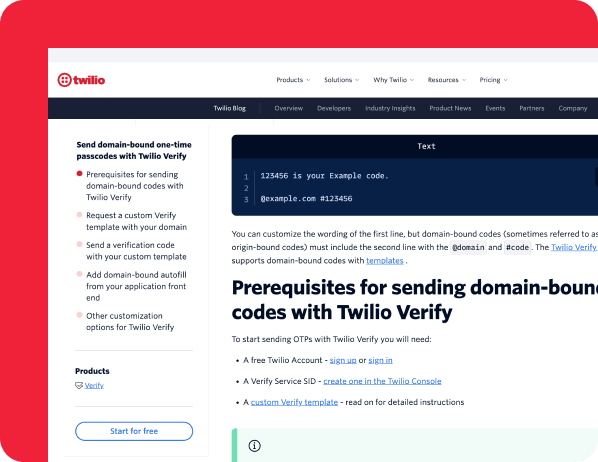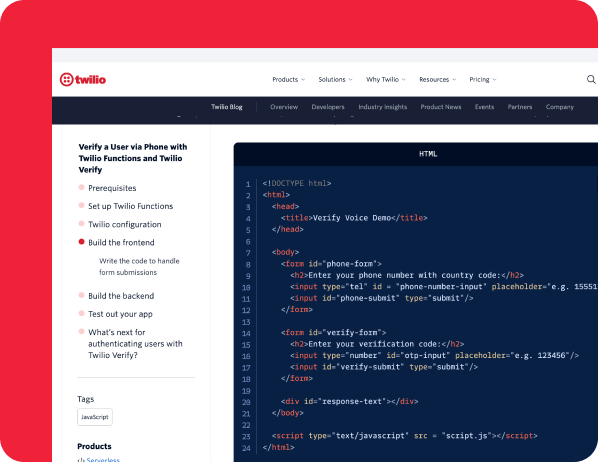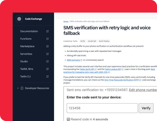 Reduce fraud, increase user trust, and launch secure login flows in minutes using Twilio’s proven verification tools. Explore guides, docs, and resources to build with confidence.