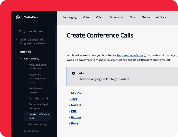 Twilio Voice SDKs support Node.js, Python, C#, Java, PHP, and Ruby, with detailed examples in each language.