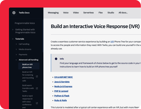 Dig into our up-to-date docs, tutorials, and guides to get started with your Twilio project.