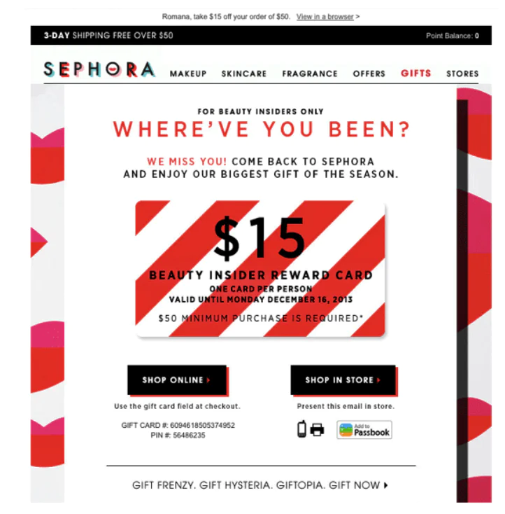 Once your setup is looking accurate and data is flowing into your destinations, you can start analyzing it. For instance, you can identify users who haven’t visited your website within the past 90 days. You can then use a platform like Twilio SendGrid to send a personalized coupon like the one pictured below to win back customers that have lapsed or previously browsed your site. Note: it's important to first collect an email address, so consider using a lightbox popup or another tool to capture the user's email before tracking 'page_scroll' and/or 'page_viewed' events.