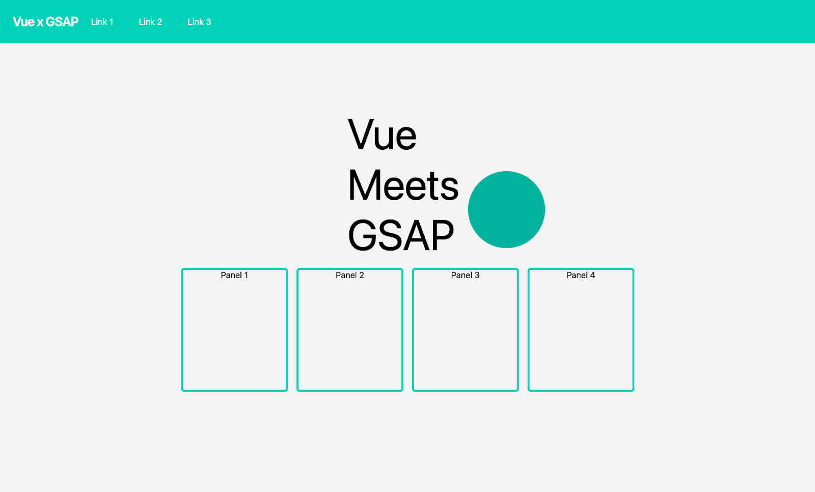 - 「Vue Meets GSAP」テキストが画面上から中央に向かって、1行ずつ下がってくる。