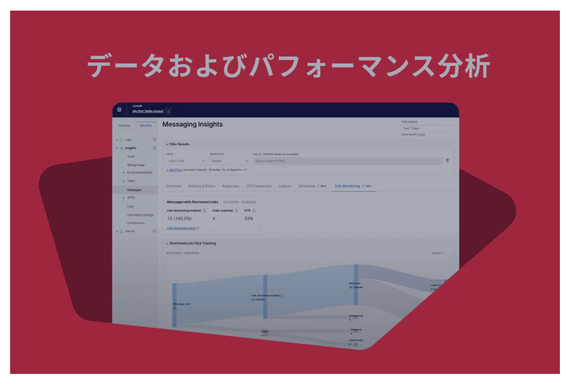 開発の簡素化、市場投入の迅速化、高い配信 率を実現します。**メッセージのスケジューリング、クリックトラッキング付きリンク短縮、高度なデータ、リアルタイムダッシュボードがどのようにビジネスに役立つかをご覧ください。