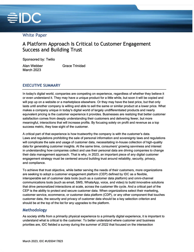 In this IDC whitepaper, sponsored by Twilio, we examine why more organizations are seeking to adopt an integrated customer engagement platform (CEP)—with a fully interoperable set of data and communication tools—in order to drive personalized interactions at scale and increase profits, all while protecting and securing customer data.